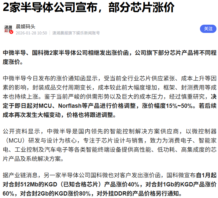 中微半导、国科微2家半导体公司相继发出涨价函,公司旗下部分芯片产品将不同程度涨价: